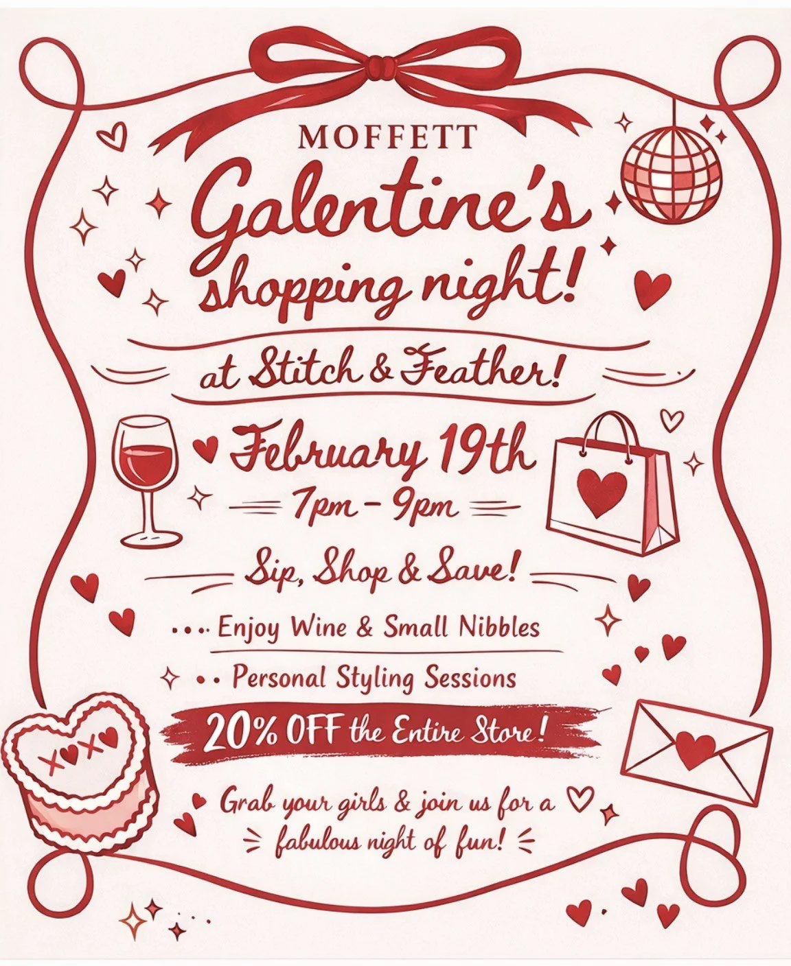 Join us for Moffett Galentine’s Shopping Night at Stitch & Feather on Thursday, 2/19 from 7:00–9:00 PM—aka the perfect excuse to sip, snack, and shop without rushing back to anything. We’ll have wine + small nibbles, a personal stylist to help you pull the cutest looks, and 20% OFF the entire store (dangerous… in the best way 😍).