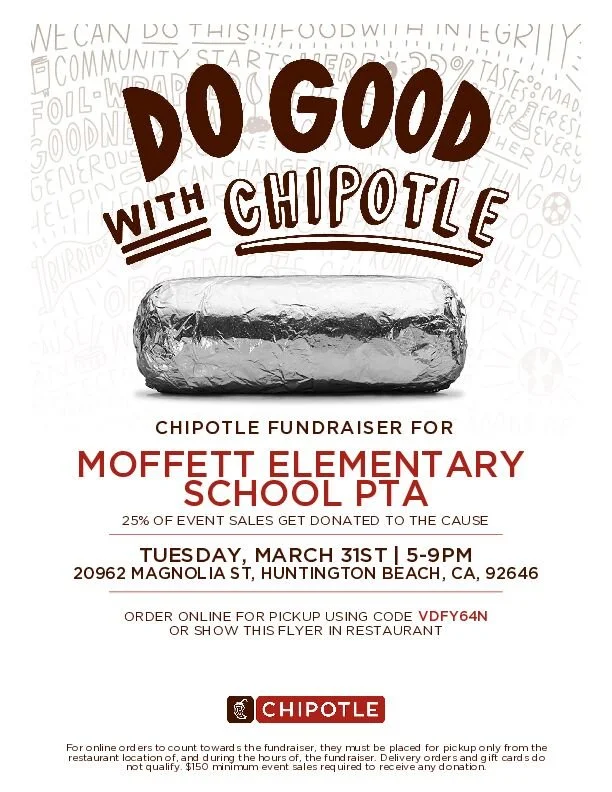 Join us for a dine out event at Chipotle! Dine in or to go orders. Show below flyer, mention Moffet or use online code and Chipotle will give back 25% to our Moffett Mustangs!